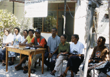 | In August 2001, the East Timorese Popular Educators' held a press conference in front of La'o Hamutuk's office in Dili. The Network was founded by nine organizations which participated in a month-long visit to Brazil organized by La'o Hamutuk. |