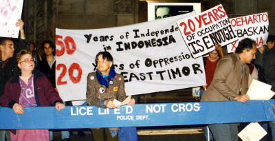 (Clicking on some of the photos will display them at higher resolution.) Introduction The Solidarity Exhibition illustrates worldwide individual and collective acts of solidarity with Timor-Leste’s struggle for self-determination during the years 1974 – 1999. Sometimes these acts were spontaneous, and sometimes they were well-planned. Some were undertaken by individuals, while others involved large groups of people. People involved in all kinds of actions -- petitions, media releases, campaigns, lobbying, demonstrations -- were moved to support the struggle of the people of Timor-Leste. The solidarity actions kept the struggle in the news and on the international agenda. Ultimately, these acts all had one and the same goal: to gain freedom and self-determination for Timor-Leste. Even today, ten years after the referendum, we still see acts of solidarity by people around the world, committed to Timor-Leste. The exhibition will run for two weeks through volunteers, and illustrates acts of solidarity with the people of Timor-Leste throughout the years and in all parts of the world. The exhibition presents solidarity activities chronologically, linking them to historic events when possible. The line will lead along large two-sided display panels arranged to create a ‘flow.’ Some ‘stop-points’ give more background information on various solidarity groups and on important historic events. Visitors will see materials used for and during these acts, such as: banners, T-shirts, songs and poetry, variety of campaign materials, and stories of individual and organised expressions of protest and support. The exhibition team presents photographic and campaign material from personal collections not exhibited before. Objectives: Enhance people’s understanding on solidarity work. Support the (re-)establishment of strong international solidarity links for and with the people of Timor-Leste. Exhibition location: Fundasaun
